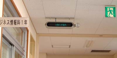 なお、本システムは「非常警報装置」と連動し校内にて災害発生時は非常ベルと同時に、「緊急文字表示」を開始し避難誘導を可能としました。