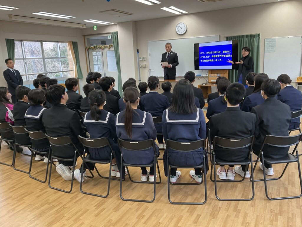 中学部・高等部では、校長先生より防災についてのお話がありました。昨年12月に青森県東方沖で震度6強の地震が発生したことを踏まえ、災害時に自分の身を守るための日頃からの備えや、正しい情報を入手することの重要性についてお話がありました。また、「地震は予知が難しい自然現象ですが、いざという時にどのように行動するかを考え、日頃から備えておくことが大切です」と、生徒一人一人に向けた言葉が伝えられました。
