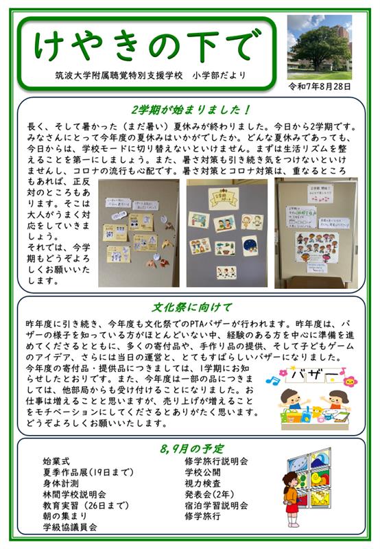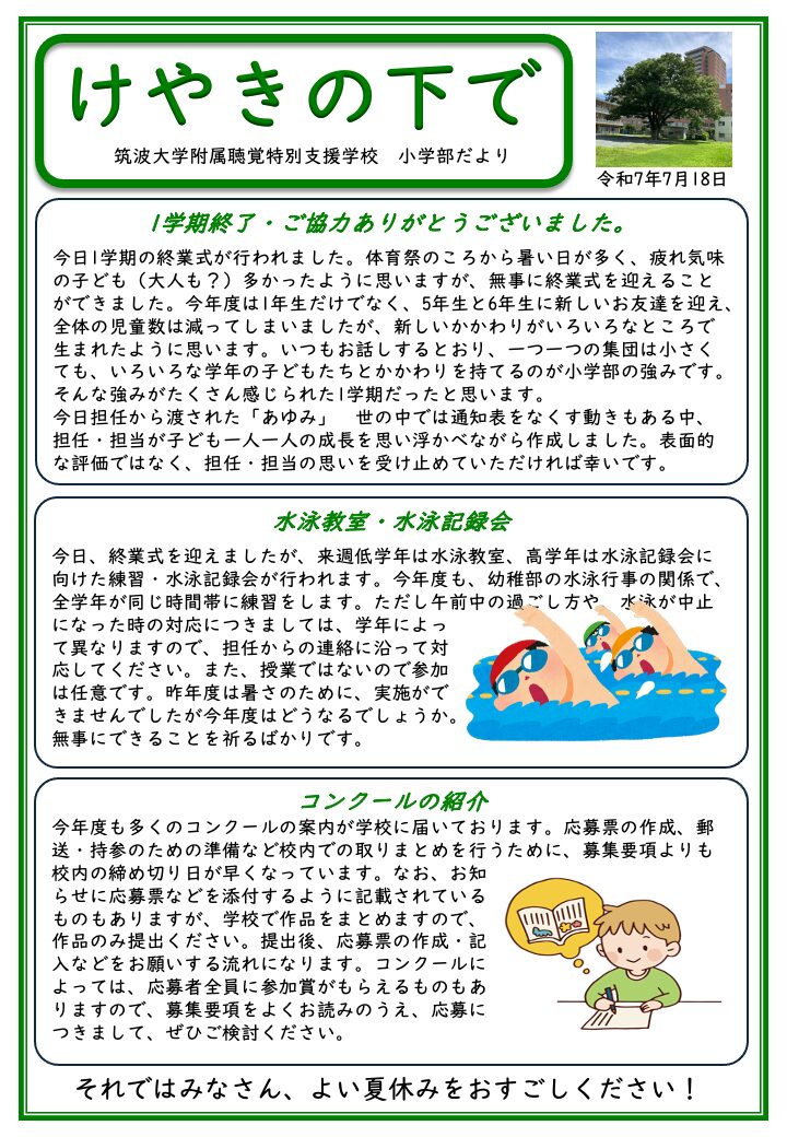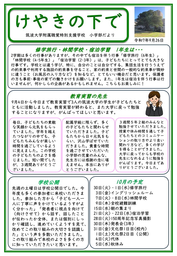 令和7年度 小学部だより『けやきの下で』を掲載しております。 2025年4月30日 発行 2025年5月26日 発行 表 裏 2025年6月27日 発行 2025年7月18日 発行 2025年8月28日 発行 2025年9月26日 発行 令和6年度のものは、こちら