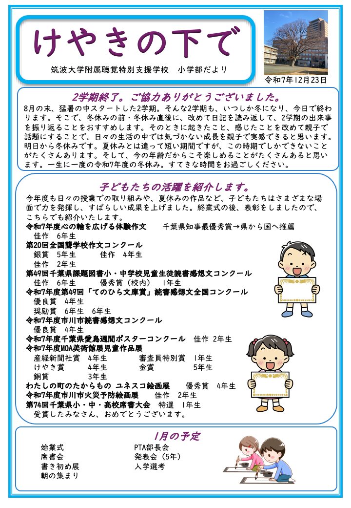 令和7年度 小学部だより『けやきの下で』を掲載しております。 2025年4月30日 発行 2025年5月26日 発行 表 裏 2025年6月27日 発行 2025年7月18日 発行 2025年8月28日 発行 2025年9月26日 発行 2025年10月29日 発行 表 裏 2025年11月27日 発行 2025年12月23日 発行 令和6年度のものは、こちら