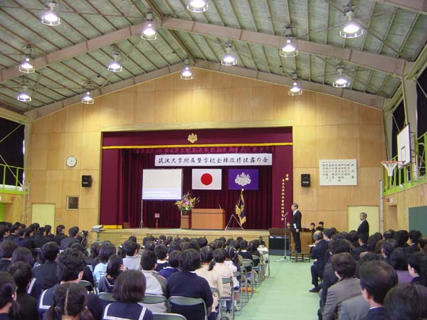 改修の完了を祝って、平成16年(2004)3月19日(金)に、新しい体育館で記念式典を行いました。式典に先だって、来賓の皆様に新しい建物をご覧いただきました。