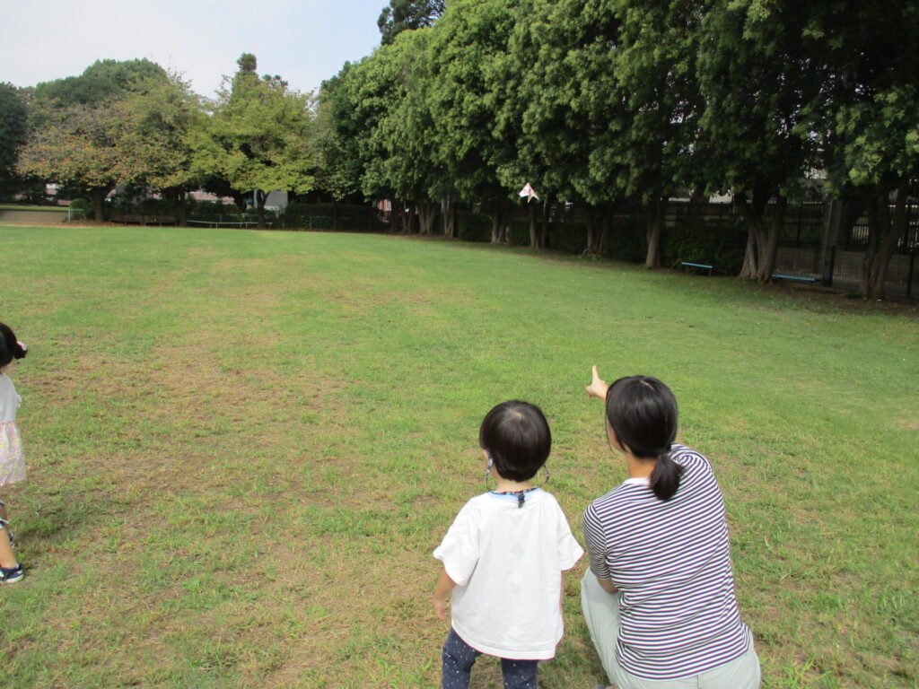 広場に着くと、先生が紙飛行機をぴゅーっと飛ばしました。目をキラキラさせて追いかけ、今度はお母さんと一緒に紙飛行機飛ばしを楽しみました。