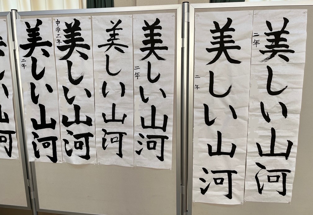 10日(水)から中学部の多目的室にて,書き初め展を開催しています。生徒たちが冬休みに書いた作品はみな力強く,それぞれの良さが出ています。学年によって課題が異なり,1年生は「花の季節」,2年生は「美しい山河」,3年生は「早春の風景」を書きました。生徒たちの作品をご覧ください。
