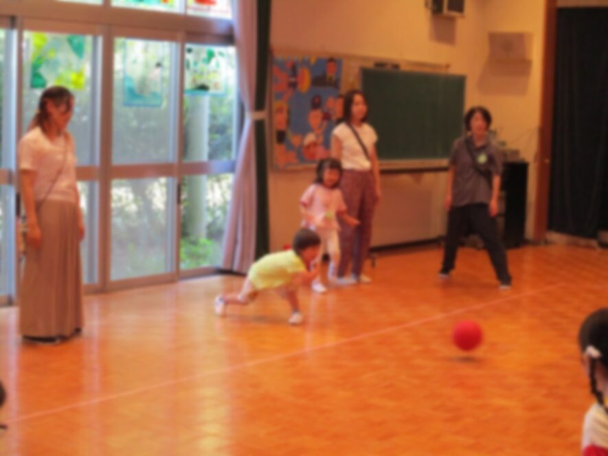 でも、回数を重ねるごとに子どもたちがどんどん積極的になり、転がってくるボールをジャンプでよけたり、足を広げて間を通したり、色々なよけ方を楽しむようになりました。