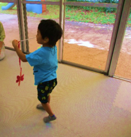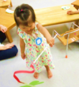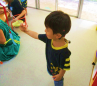 のりを使うのは初めてでしたが、先生がのりをちょっとだけつけて塗る様子を実際に近くで見たことで、お母さんやお父さんと協力しながら上手に目や羽にのりをつけて貼ることができました。そして最後はリボンをつけて完成です。自分の作ったとんぼを持って先生と一緒に走ったり、くるくる回したり、親子で楽しそうに触れ合ったりする姿が見られました。みんな自分の作った作品を見て嬉しそうにしていました。