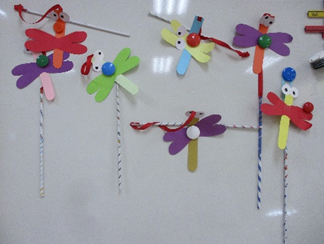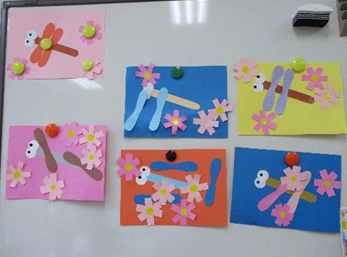 楽しい製作の時間となりました。歌に出てくるすいすいと飛んでいるとんぼのような色とりどりのとんぼができましたね。