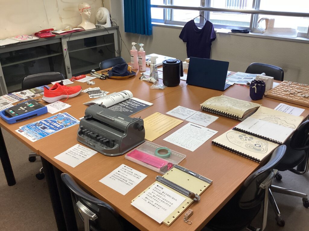 当日は午前中に「自己紹介」「名刺交換」「寄宿舎見学」を行いました。また、視覚障害者が日常生活で使用している道具の紹介もしていただきました。机いっぱいに広げられた道具には全員驚いていました。