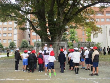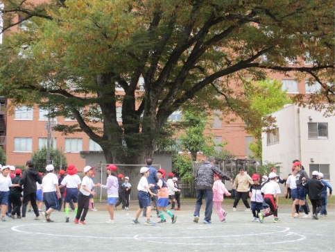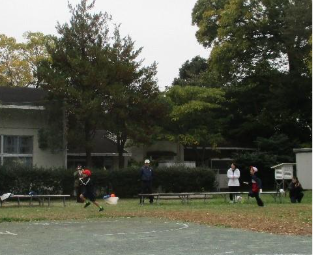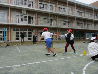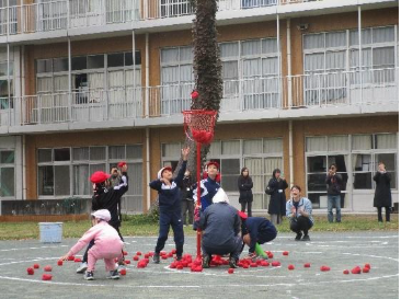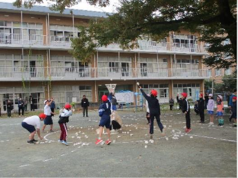3チームに分かれ、総当り戦で行いました。高学年が線の外側、低学年が線の内側から玉を投げ入れました。一個差で勝敗がついた対戦もあり、とても白熱した試合を繰り広げていました。