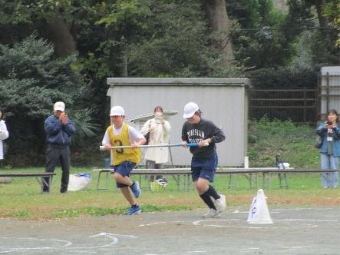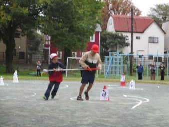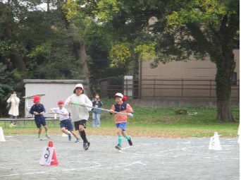 玉入れと同じ3チームに分かれて競い合いました。高学年の児童が低学年の児童をリードして走る姿が印象的でした。