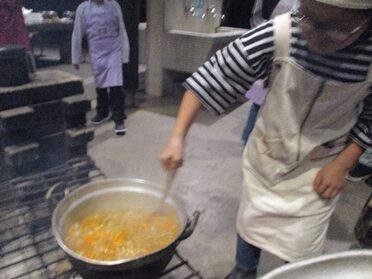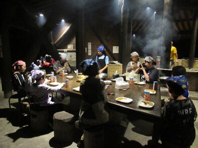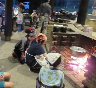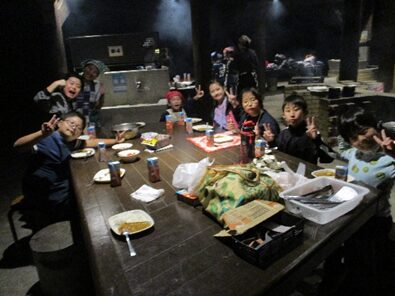 野外炊飯では、薪を割り、かまどに火をおこし、飯ごうでご飯を炊き、野菜を切り、肉と一緒に煮込んで、カレーライスを作りました。調理実習や家庭での練習の成果が出て、子どもたちは自信をもって調理に臨んでいました。日が暮れていくなか、かまどの火に照らされる子ども達の顔は、また一段と頼もしく見えました。カレーもご飯も、みんなで平らげました。何杯おかわりしたでしょうか。
