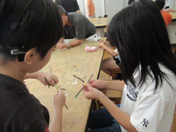オリエンテーリングの時に拾った枝を使って、「ガッツアイ」というネイティブアメリカンのお守りを作りました。十字に重ねた枝に毛糸を巻いていきます。コツをつかむと、黙々と完成を目指したり、友達同士で教え合ったりして、個性豊かな作品に仕上がりました。