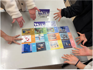 途中で校長先生に会いました。校長先生に「○○ちゃん、何ひろったの?いいなあ」と話しかけられると、好きな葉っぱやお花を入れた袋を嬉しそうに見せている子どももいました。高等部棟の入り口では、生徒たちが忙しそうに翌日の文化祭の準備をしていました。お兄さん、お姉さんがはさみでテープを切ったり、扉に飾りをつけたりするのを興味津々で見ていると、お兄さんが「やりたい?」とやさしく声をかけてくれました。そして、ちょっとだけお手伝いをさせてくれました。嬉しかったね。