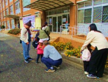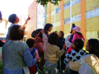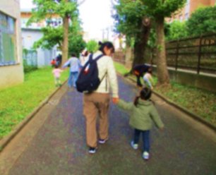 2歳児グループで、校内のおさんぽに行きました。青空が広がるとても気持ちがよい日でした。おかあさんと手をつなぎ、しゅっぱーつ!