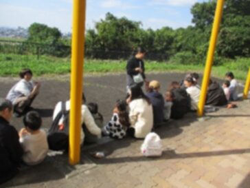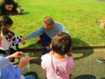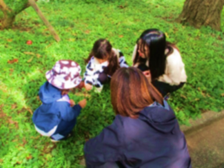 道中には草花がたくさん咲いています。ねこじゃらしを見つけては、ふさふさした部分がとても気持ちよくて手で触ったり、親子で顔にあててくすぐりあったりしていました。また、広い中庭を嬉しそうに走り回ったり、葉っぱをいっぱい集めて袋に入れたり、それぞれが好きなものに夢中になる姿が見られました。