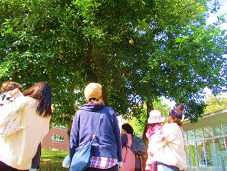 寄宿舎の方へ歩いていくと、大きな三宝柑の木がありました。見た目がデコポンに似ており、大きな実を先生がくるくる回してもぎました。子どもたちは夢中になってじっと見たり、においをかいだり、「とりたい」というように手を伸ばしたりしていました。