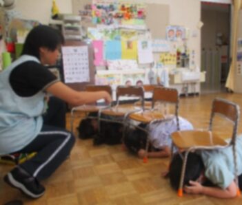 非常ベルが鳴り、子どもたちは頭を守るためにイスやテーブルの下に頭を隠していました。