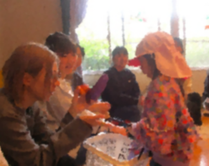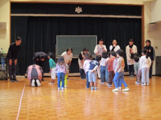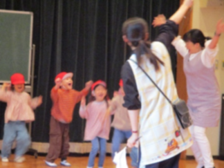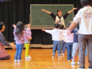 あいさつの後は、体をうごかす踊りをしました。この日の担当の先生の動きに合わせて、「大きな栗の木の下で」を踊りました。手を大きく広げて、大きな栗の木を作っていました。