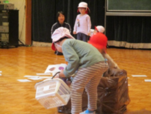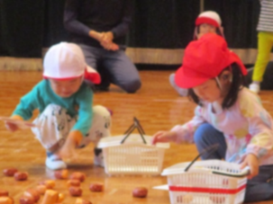次にゲームをしました。スタートラインから走っていき、ホールの真ん中にあるカードを2枚めくります。そのカードに描かれている栗の数とさつまいもの数だけ、かごの中に入れるゲームです。