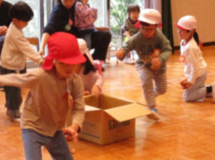 ゲームが楽しかった気持ちが片付けるときにも出ていて、はりきって走り、栗やさつまいもを箱の中に入れていました。
