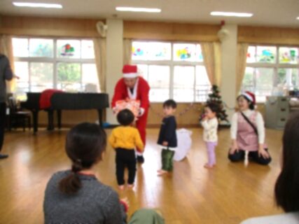 1歳児グループのもとにもサンタさんが来てくれました。サンタさんの登場にドキドキする子どももいれば、興味津々でサンタさんのそばに近づく子どももいました。サンタさんは、一人ひとりに「どうぞ。」とプレゼントを手渡してくれました。プレゼントは小さなじょうろとバケツです。子どもたちはとても嬉しそうで、早く遊びたくて先生に「開けて!」というように渡してくる様子もみられました。お家でたくさん遊んでね。