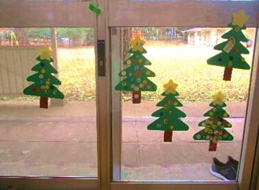 まず、紙のツリーにシールをたくさんぺたぺた貼りました。窓にたくさんのかわいらしいツリーが飾られました!