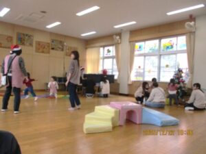 リズム遊びをしました。ピアノの曲に合わせて歩いたり走ったりしました。また、ピアノの音が止まってから子どもたちにこちょこちょもしました。こちょこちょをされると子どもたちは「きゃはは~」と笑い、にこにこと嬉しそうにしていました。