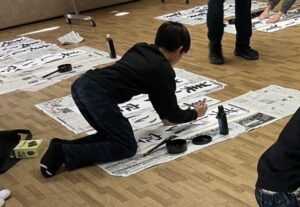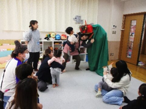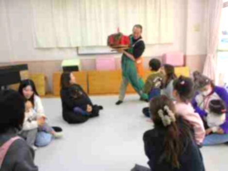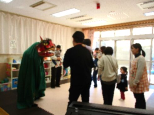 プレイルームでいつものように名札をつけていると、大きな大きなお獅子がやってきました。大きな口をカチカチ鳴らし、子どもたちのところに近づいてきます。「だれかきた!」「わあ!びっくり!」というようにみんな目を丸くし、怖くてお父さんやお母さんや先生に抱きついていました。