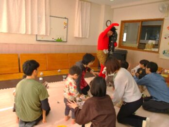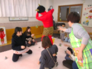 1歳児グループで豆まきをしました。大好きなふれあい遊びで、「ぶーらん、ぶーらん」といつものように先生にたくさん揺らしてもらいながら遊んでいると…廊下から「お~い!」と手をふる赤おにがいます。「誰だろう?」と不思議そうに見つめている子どもや、怖くてお母さんやお父さんにぎゅっとしがみつく子どももいました。