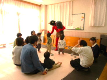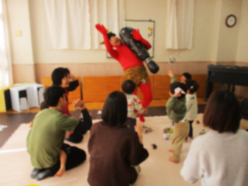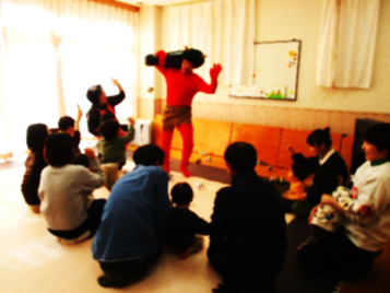 事前に丸めていた紙玉を「ポ~イ!」「エイッ!」「おには~そと!ふくは~うち!」と、お母さんやお父さん、先生と一緒に赤おにに向かって投げました。最初は赤おにを見て怖がっていた子どもも、いつの間にかみんなと同じように「エイッ!」と笑顔で赤おにに向かって紙玉を投げる様子が見られました。