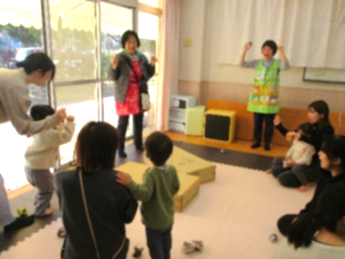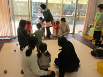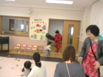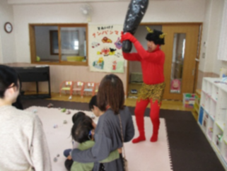…すると、外に赤おにがいてみんなびっくり!赤おにを見て興味津々に近づく子どももいれば、怖くてお母さんにぎゅっとしがみつく子どもの姿も見られました。赤おにに近づくと連れ去られそうになりましたが、みんなで力を合わせて紙玉を投げると、赤おにの姿が見えなくなりました。