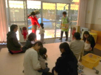 はじめに、先生と豆まきの絵本を見ました。かわいいおにが「いーれーてー」とやってくるお話です。豆まきごっこも楽しみました。