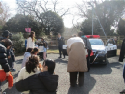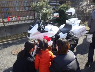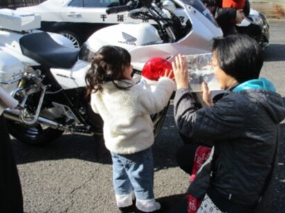 ひとりひとり子ども達にパトカーの写真を見せて、出発!暖かい上着を着てから、みんなで外へ出ていきます。優しいおまわりさんが、白バイやパトカーに乗せてくれました。お母さん、お父さんも、ニコニコ笑顔です。