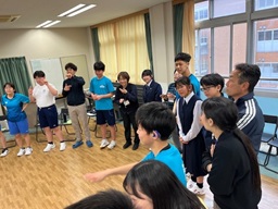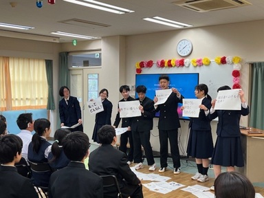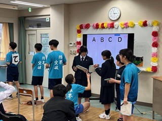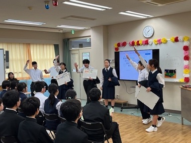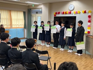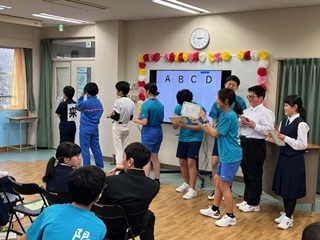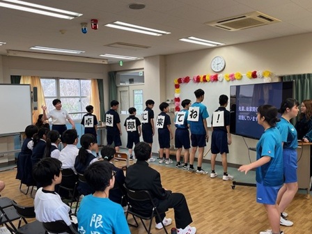 委員会,部活動の紹介後,生徒会企画「お絵描き伝言ゲーム」と「誕生日ゲーム」を行いました。伝言ゲームでは,イラストでお題を伝えていきます。時間内に分かりやすく描いた絵に,観ている側も「おぉー,上手!」と大興奮していました。誕生日ゲームでは,手話とジェスチャーだけを使って誕生日順に大きな輪を作ります。間違えずに並ぼうと,1年生から3年生まで楽しみながらコミュニケーションを取ることができました。会の終わりには役員会から1年生に記念品をプレゼントしました。