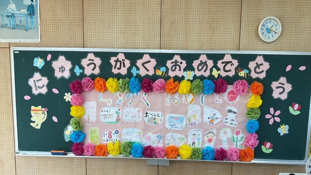 小学部棟でも、華やかな掲示物で子どもたちを迎えました。玄関の壁面装飾です。