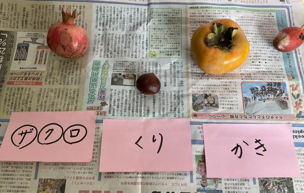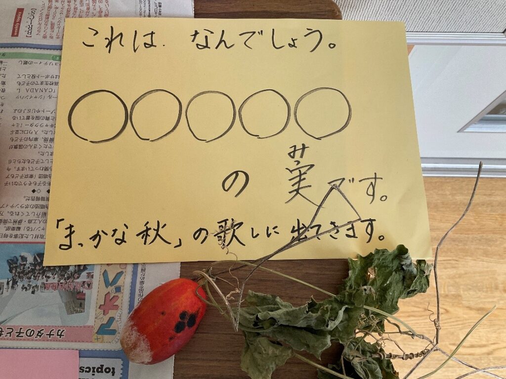 玄関や教室前の廊下には、「秋」を表す実物を展示し、子どもたちとのやりとりが活発にできるよう工夫しています。
