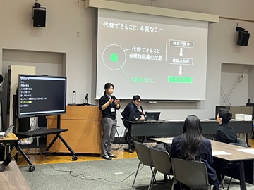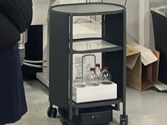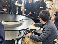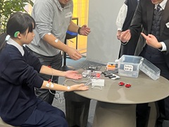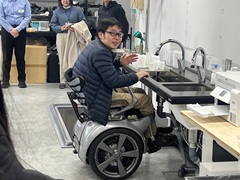 午後には、インクルーシブラボを見学し、様々な障害がある人が研究をしやすい環境について学びました。たとえば、「車椅子」は人によって使いやすい高さがまちまちであることなどの説明を受けました。その後、ボタンひとつで高さを変えられる車椅子や、車椅子を横付けしなくてもよい洗面台など、生徒が実際に装置を動かして使ったり、並木先生ご自身が電動車椅子で使用する様子を見せていただいたりしました。他に、聴覚障害者が考案した、物がとりやすくてお互いの顔が見える円卓なども紹介していただきました。また、配膳ロボットを応用したロボットを実際に動かして、シェルフ(棚)を運ぶ様子も見せていただきました。