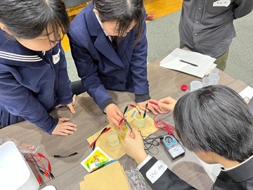 午前中はまず、障害・合理的配慮・世界で活躍する聴覚障害の研究者などについての講義を受けました。その後、グループに分かれて、レモンアクエリアスでボルタ電池をつくりました。どのような工夫をすれば発光ダイオードを光らせることができるのか、方法を工夫してみつける実験をしました。
