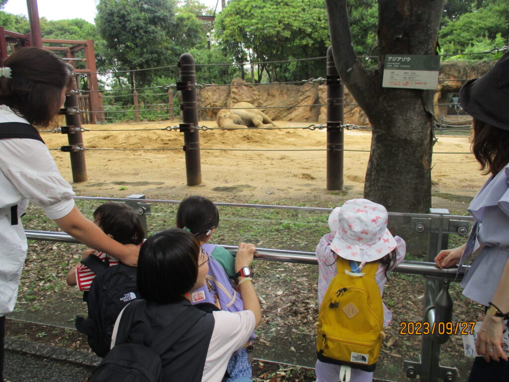 大きなゾウが、ごろんと横になっていました。寝ているのかな? 子どもたちはじっと見ていました。