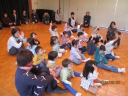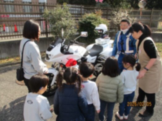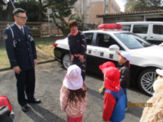 2月5日に交通安全教室を行いました。市の交通安全教室の指導員の方と警察の方が来てくださいました。道路を歩くときのルールや、外で遊ぶときに気をつけることを教わりました。