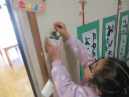 子ども達は鬼が嫌がる「やいかがし」も作りました。3年生は教室の出入口など、鬼が入ってきそうな場所を自分達で考えて飾りました。