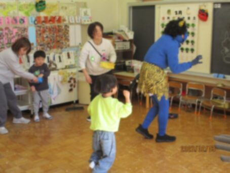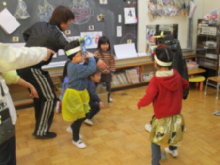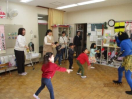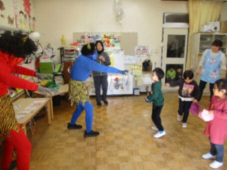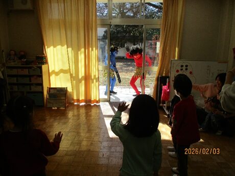 小鬼達は先生を連れて行こうとしたり、豆を投げられると「うわーっ!」と言ってやられたりと豆まきを楽しませてくれました。